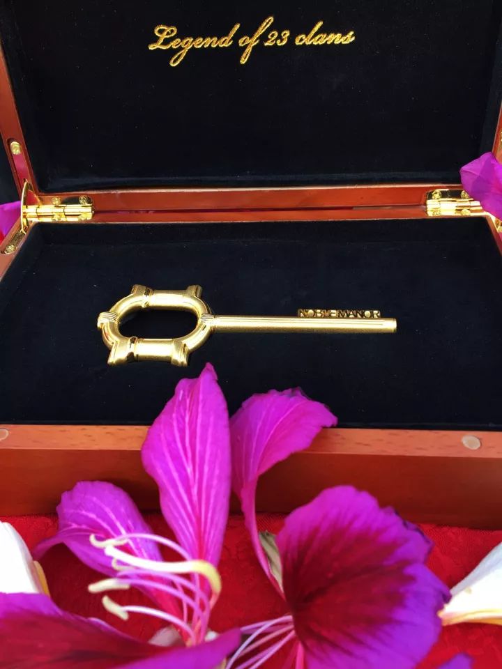 ? ? ? ? 交房吉時,管家和維序們莊嚴的站立兩側(cè),以尊崇的禮儀恭迎業(yè)主回家。恒興集團總裁王偉文親臨現(xiàn)場道賀,同時贈予886號莊園業(yè)主云頂莊園業(yè)主專屬定制千足金鑰匙,這把金燦燦的金鑰匙代表著云頂莊園業(yè)主專屬圖騰,同時也是云頂莊園23個傳奇家族認證。