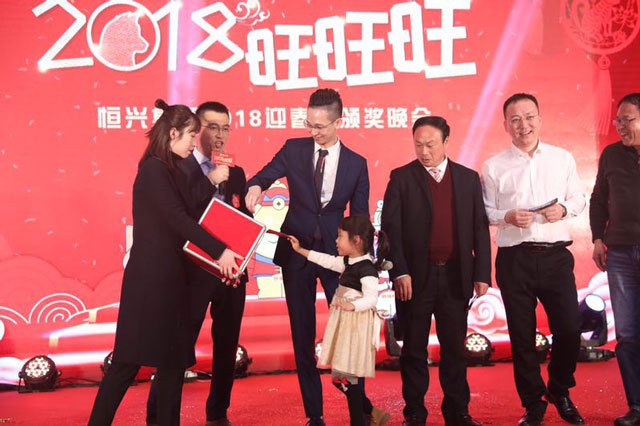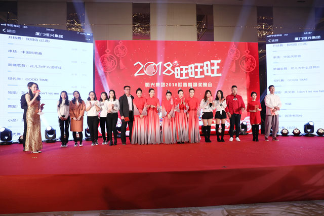 ? ? ? ? 節(jié)目表演之間還穿插鼓舞人心的《2017輝煌業(yè)績》視頻播放,溫馨難忘的《2017我們在一起》照片回顧,以及激動人心的幸運大抽獎環(huán)節(jié),掀起現(xiàn)場一波又一波的小高潮。隨后,王偉文總裁攜恒興集團中層領導獻唱恒興之歌《永恒的星座》,大家熱血沸騰、團結(jié)一心、齊聲合唱,讓整場晚會然若演唱會現(xiàn)場,熱鬧非凡。