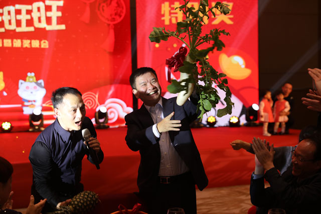 ? ? ? ? 本場晚會大的亮點是“特殊獎”頒獎環(huán)節(jié),由恒興集團孔宇峰董事、副總裁親自主持,感謝柯董這一年來辛勤工作、睿智決策,帶領恒興集團一步一步走向輝煌??卓傇诂F(xiàn)場為柯董送上“菜頭”和“菠蘿”,寓意恒興集團及柯董一家新年好彩頭和好運旺旺來。隨后,柯董抽取幸運大抽獎的獎項——5800現(xiàn)金大獎花落投資部的莊巧玲的手中??绿殖伺d抽出總額達十萬港幣的獎項,將晚會推上了一波新高潮。本晚會的中獎率達80%,幾乎人人有獎,各個喜笑顏開。