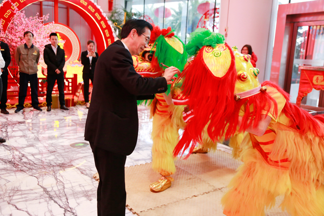 ? ? ? ? 上午吉時,一對金色舞獅伴隨著鑼鼓“咚咚”的聲響,以慷鏘有力的步伐隆重登場。廈門恒興集團資產(chǎn)管理部總經(jīng)理盧海、財富中心物業(yè)總經(jīng)理宋維超為兩頭象征吉祥如意的瑞獸點睛?!熬Α焙汀敖稹敝C音, 舞獅點睛有“點金”的意義,象征著新年財源滾滾。
