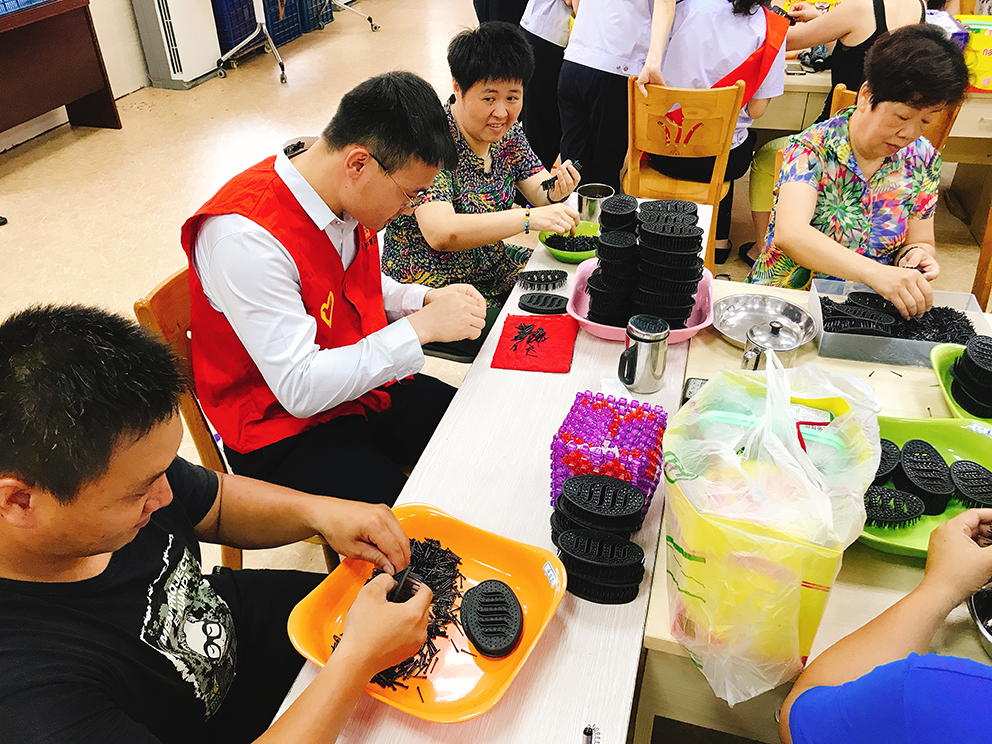 活動(dòng)結(jié)束后,學(xué)員們都回到自己的座位,認(rèn)真地做著手工,有的做梳子,有的做串珠,有的做網(wǎng)花。恒興集團(tuán)的志愿者也與他們一起,用一針一線,一釘一鉚完成一個(gè)一個(gè)的作品,學(xué)員們紛紛表示:很喜歡志愿者們來(lái)看望他們,與他們聊天、做事,分享他們的人生歷程,雖然他們身體有殘缺,但和正常人一樣渴望關(guān)愛(ài),也希望能夠用自己的雙手創(chuàng)造財(cái)富,創(chuàng)造幸福的人生。