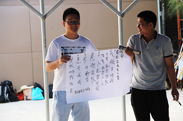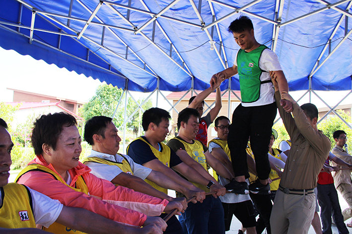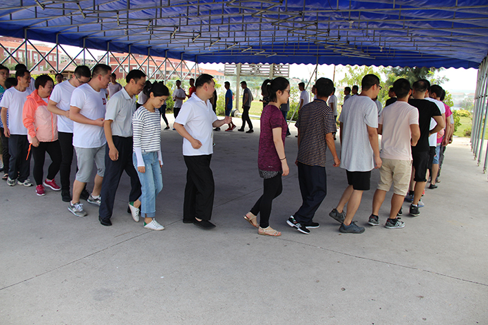 隨后,按照教練的指揮大家進(jìn)入“團(tuán)隊(duì)組建”分成了四個(gè)小隊(duì),“恒心隊(duì)”、“戰(zhàn)狼隊(duì)”、“飛虎隊(duì)”、“好漢隊(duì)”……每個(gè)隊(duì)通過取隊(duì)名、想口號、選隊(duì)歌、擺造型來各自進(jìn)行展示,拼士氣、展風(fēng)采,這是促進(jìn)員工間溝通交流,增加彼此了解的熱身活動。緊接著充滿挑戰(zhàn)性的拓展活動開始了,各隊(duì)開始根據(jù)教練發(fā)放的任務(wù)展開激烈的比拼,“神筆馬良”所有隊(duì)員各自拉著一根綁著大毛筆的繩子末端,在不接觸毛筆的情況下完成各自隊(duì)名的書寫,培養(yǎng)團(tuán)隊(duì)協(xié)作能力。