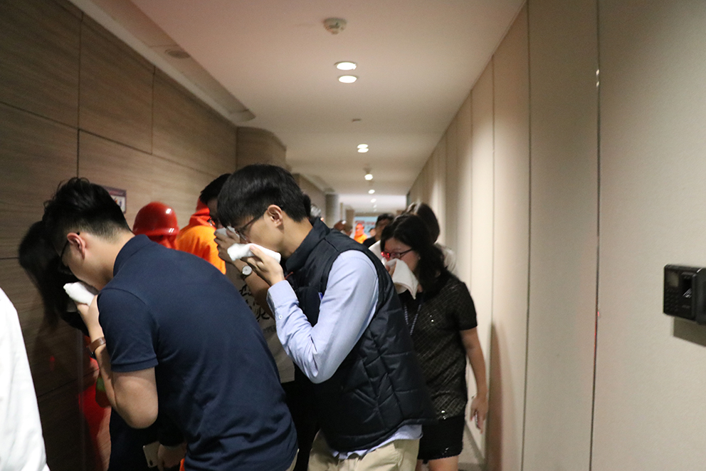 隨著演習(xí)煙霧彈被拉開,煙霧迅速?gòu)浡?,廈門財(cái)富中心消防演練正式開始,大廈火災(zāi)自動(dòng)報(bào)警系統(tǒng)探測(cè)到大廈7層出現(xiàn)大量火警信號(hào),中控室值班員確認(rèn)火警后立即上報(bào),現(xiàn)場(chǎng)啟動(dòng)大廈火災(zāi)應(yīng)急預(yù)案,啟動(dòng)消防廣播,通知各應(yīng)急小組就位,滅火組維序員身穿防護(hù)服進(jìn)行滅火器、消火栓使用演練;疏散組有序的引導(dǎo)樓層人員通過消防安全通道撤離到大廈地面廣場(chǎng)的安全地帶;整個(gè)消防演練都進(jìn)行得有條不紊,全體參演人員行動(dòng)迅速、紀(jì)律嚴(yán)謹(jǐn)、演練認(rèn)真到位。