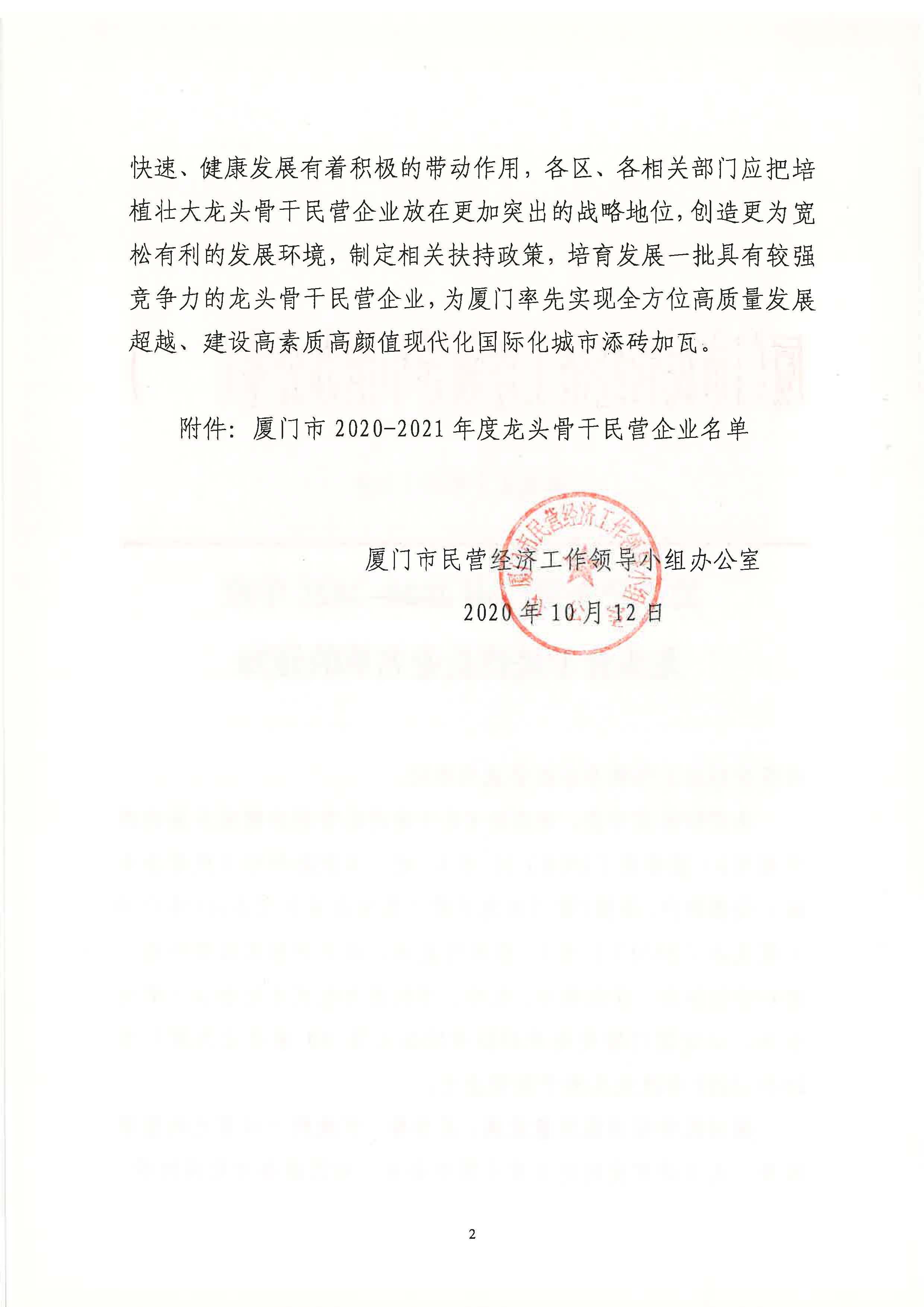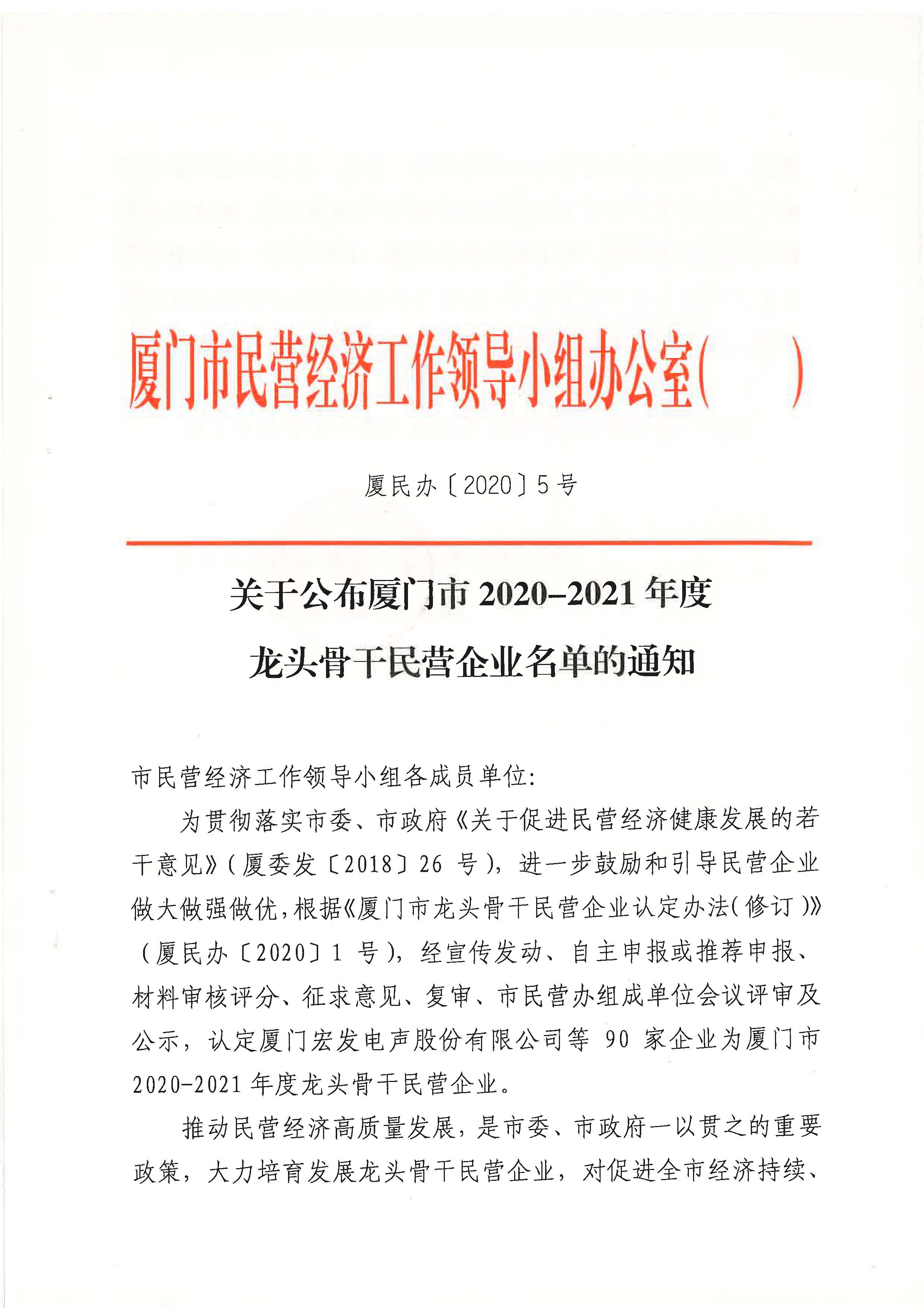 ? ? 為貫徹落實(shí)市委、市政府《關(guān)于促進(jìn)民營經(jīng)濟(jì)健康發(fā)展的若干意見》(廈委發(fā)[2018]26號(hào)),進(jìn)一步鼓勵(lì)和引導(dǎo)民營企業(yè)做大做強(qiáng)做優(yōu),根據(jù)《廈門市龍頭骨干民營企業(yè)認(rèn)定辦法(修訂)》(廈民辦[2020]1號(hào)),經(jīng)宣傳發(fā)動(dòng)、自主申報(bào)或推薦申報(bào)、材料審核評(píng)分、征求意見、復(fù)審、市民營辦組成單位會(huì)議評(píng)審及公示,認(rèn)定廈門宏發(fā)電聲股份有限公司等90家企業(yè)為廈門市2020-2021年度龍頭骨干民營企業(yè)。